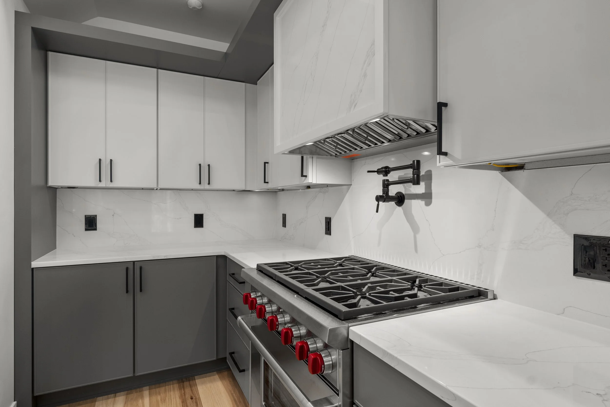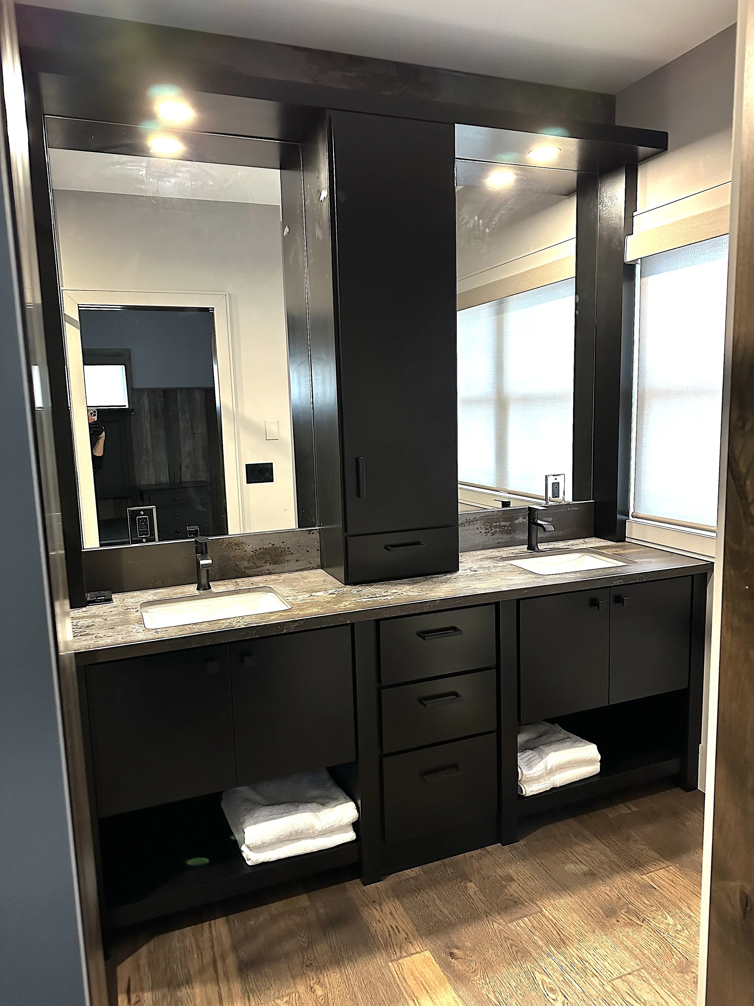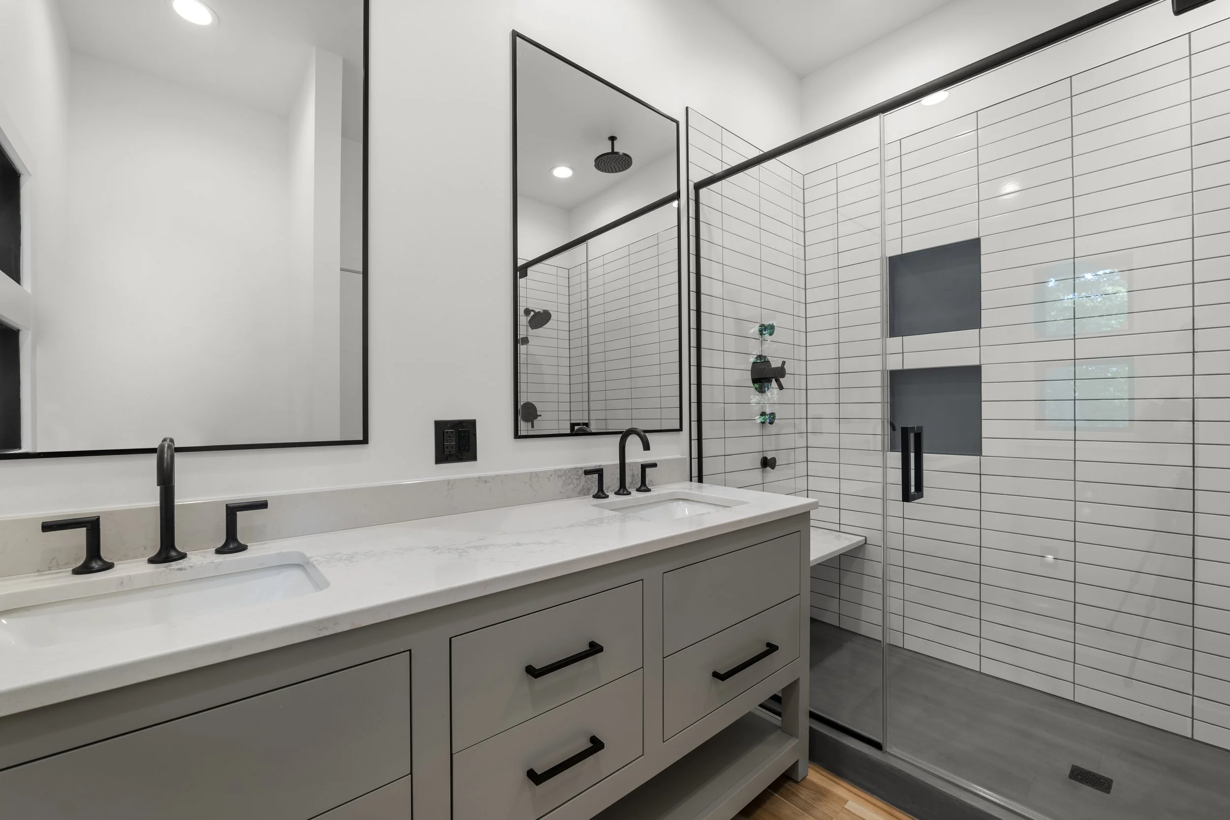 Tile walls, tile flooring, and Dekton porcelain wall, bench, and niches.